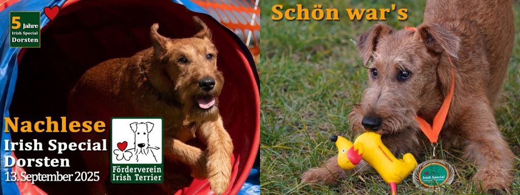 Wir bedanken uns für diesen tollen Tag bei allen Teilnehmern und Teilnehmerinnen, allen Besucherinnen und Besuchern, die sich mit oder ohne Irish Terrier auf den Weg nach Dorsten gemacht haben. Ein großes Dankeschön geht an das gesamte Team der OG Dorsten ’90, das sich mächtig für unser Irish Special ins Zeug gelegt hat und an alle Helferinnen uns Helfer.